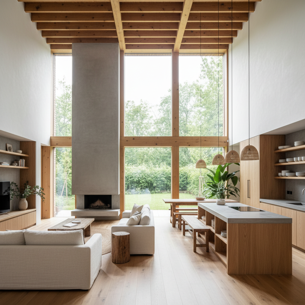 Naturalne materiały wykończeniowe: Elewacje często łączą w sobie tynk mineralny z drewnianymi panelami, blachą na rąbek stojący czy płytami włókno-cementowymi. Takie zestawienie podkreśla ekologiczny i nowoczesny charakter budynku.
