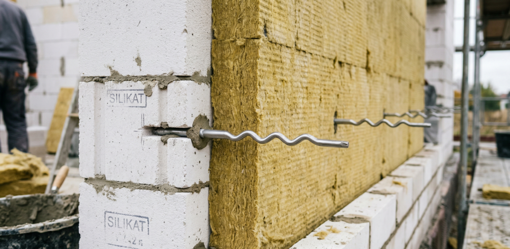„Zaleca się, aby warstwę konstrukcyjną i osłonową murować jednocześnie, pasami o wysokości nieprzekraczającej 50 cm. Najpierw wznosimy fragment ściany nośnej, następnie montujemy płyty termoizolacyjne, a na końcu wykonujemy warstwę elewacyjną. Taki sposób pracy zapewnia stabilność konstrukcji na każdym etapie i ułatwia prawidłowy montaż kotew.” – radzi Joanna Nowaczyk, Doradca Techniczny Grupy SILIKATY.