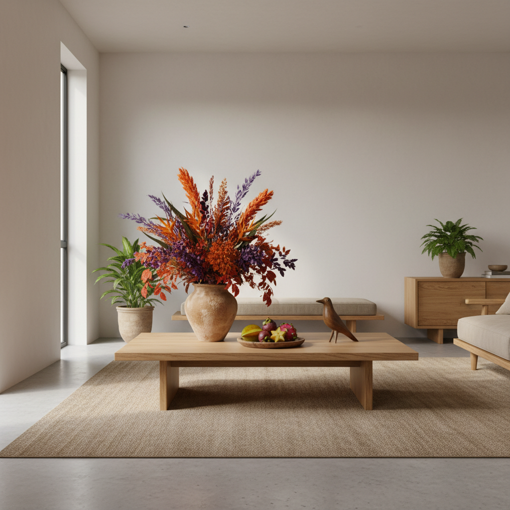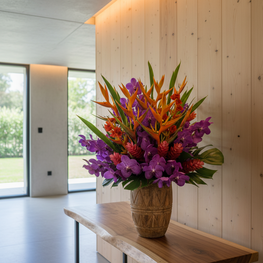 Podstawą tego trendu jest połączenie śmiałych, egzotycznych kwiatów z naturalnymi, surowymi materiałami. Wyobraź sobie bukiet, w którym intensywnie kolorowe kwiaty kontrastują z surowym drewnem, ręcznie robioną ceramiką czy metalowymi akcentami. To styl, który celebruje niedoskonałość, autentyczność i siłę natury.