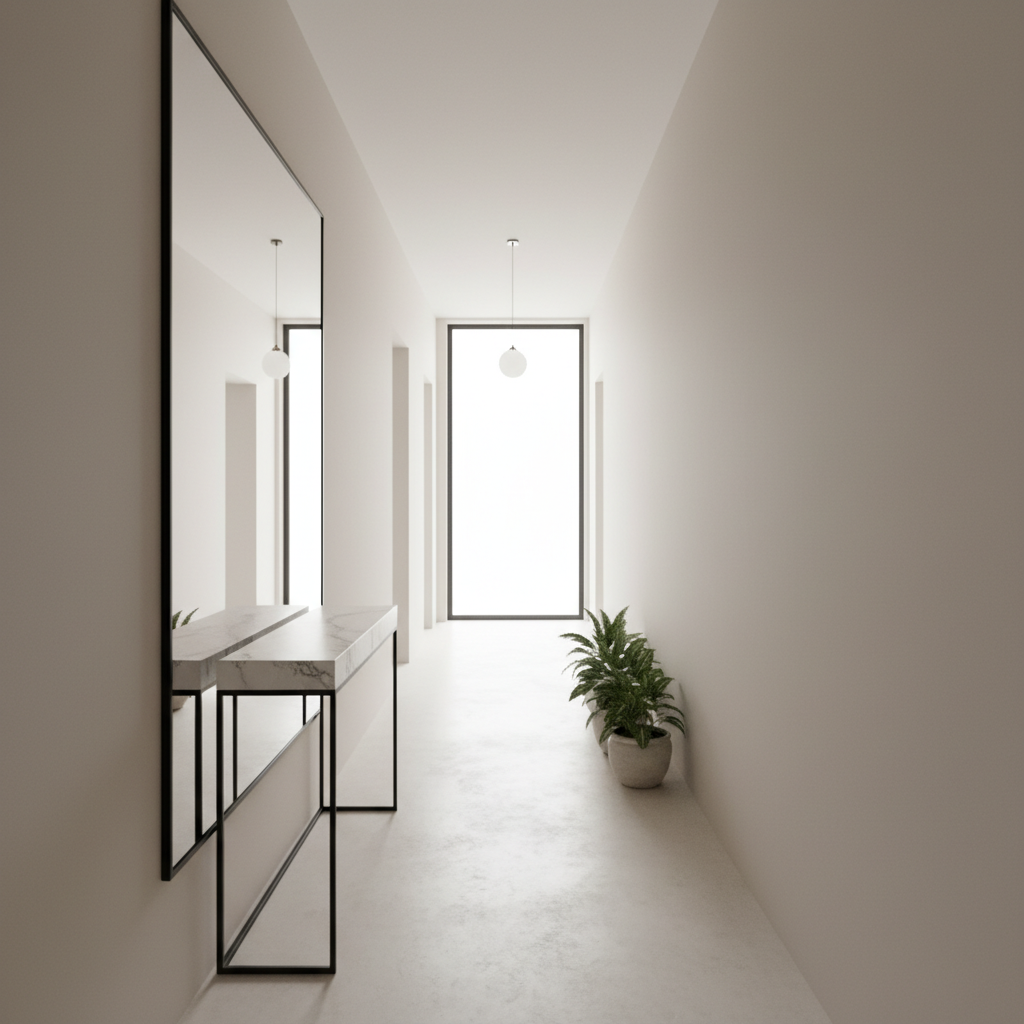 Wąski korytarz może wydawać się klaustrofobiczny. Umieszczenie dużego, poziomego lustra na jednej z dłuższych ścian natychmiast stworzy wrażenie przestronności. Odbicie sprawi, że korytarz wyda się dwa razy szerszy.