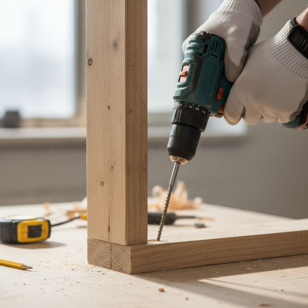 Powtórz ten proces dla pozostałych elementów, tworząc kwadratową ramę. Sprawdź przymiarem kątowym, czy wszystkie narożniki mają kąt 90 stopni. Twój stabilny stojak jest już prawie gotowy!