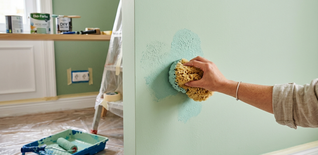 Gąbkowanie to technika dekoracyjnego malowania ścian i innych powierzchni, która polega na nakładaniu farby za pomocą gąbki. Zamiast gładkiego, jednolitego pokrycia, jakie uzyskujemy przy użyciu wałka czy pędzla, gąbka pozostawia na powierzchni charakterystyczny, nieregularny wzór. Poprzez delikatne „stemplowanie” lub pocieranie ściany nasączoną farbą gąbką, tworzymy unikalne efekty specjalne. Główną zaletą tej metody jest jej wszechstronność – w zależności od użytej gąbki, kolorów farb i sposobu aplikacji, możemy uzyskać subtelne, mgliste przejścia tonalne, wyraziste, trójwymiarowe faktury, a nawet wzory przypominające naturalny kamień czy drogocenną tkaninę.