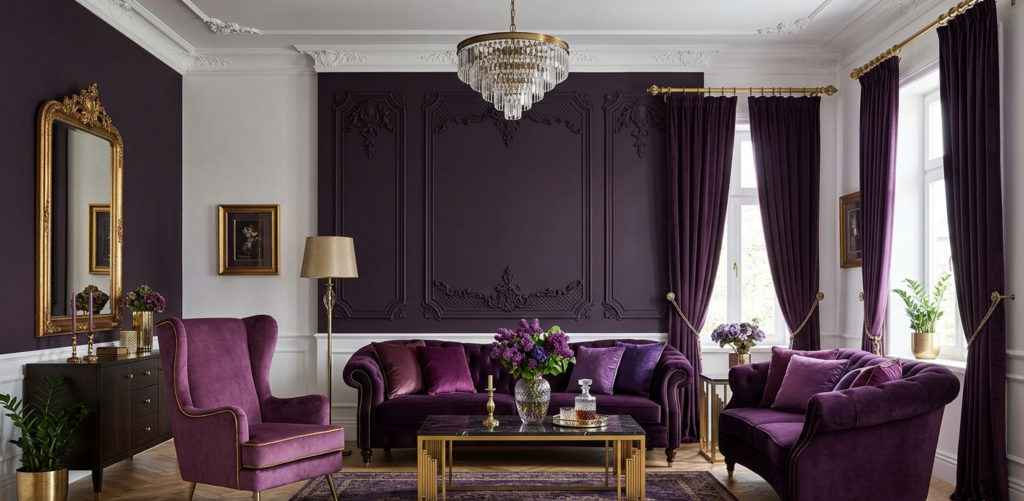 Ściany jako tło dla luksusu: Pomalowanie jednej, akcentowej ściany na intensywny, matowy fiolet może stanowić spektakularne tło dla jasnych, eleganckich mebli. Taka ściana natychmiastowo nadaje wnętrzu głębi i szlachetności. W połączeniu z wysokimi listwami przypodłogowymi i sztukaterią, fioletowe ściany tworzą ramę dla prawdziwie pałacowej aranżacji.