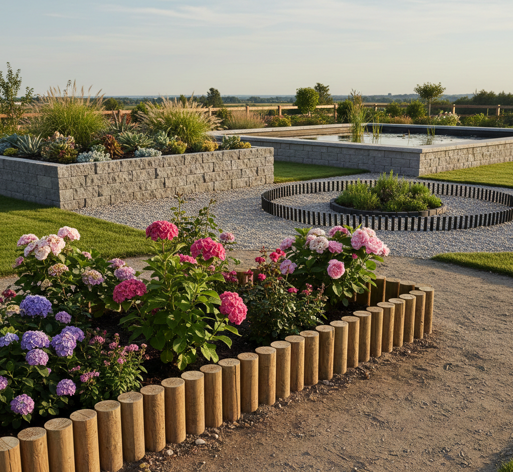 Rollbordery to wariacja na temat palisad. Są to drewniane, połówkowe paliki połączone ze sobą elastycznym drutem lub taśmą. Sprzedawane w rolkach, są niezwykle proste w montażu i idealnie nadają się do szybkiego urządzania ogrodu. Ich największą zaletą jest elastyczność – bez trudu uformujesz z nich płynne łuki i nieregularne kształty, idealnie dopasowując linię obrzeża do swojej wizji. To fantastyczne rozwiązanie dla początkujących ogrodników i do ogrodów o swobodnej, naturalistycznej kompozycji.