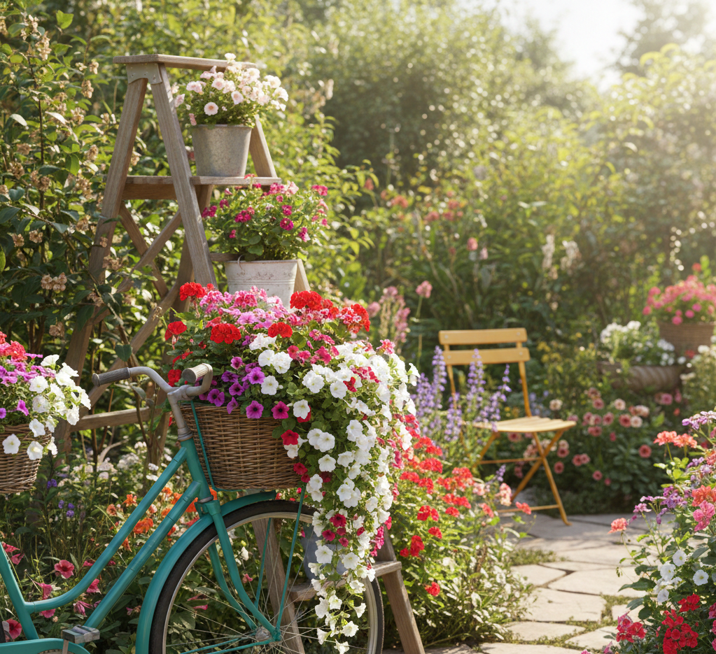 Stary rower, który od lat kurzy się w garażu, może stać się najbardziej zjawiskową ozdobą Twojego ogrodu. To jeden z najpopularniejszych i najbardziej fotogenicznych pomysłów na upcykling w ogrodzie. Wystarczy oprzeć go o drzewo, płot lub ścianę domu i ozdobić kwiatami.