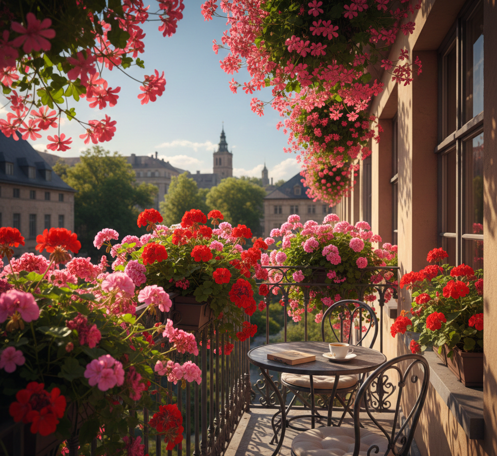 Pelargonie to rośliny wybitnie światłolubne. Aby obficie kwitły, potrzebują jak najdłuższego dostępu do bezpośredniego słońca – minimum 6-8 godzin dziennie. Idealne będą dla nich balkony i tarasy o wystawie południowej, południowo-zachodniej lub zachodniej. W cieniu lub półcieniu pelargonie również będą rosły, ale ich kwitnienie będzie znacznie słabsze, pędy staną się wybujałe i wiotkie, a liście mogą żółknąć. Im więcej słońca, tym więcej kwiatów – to podstawowa zasada w uprawie pelargonii.