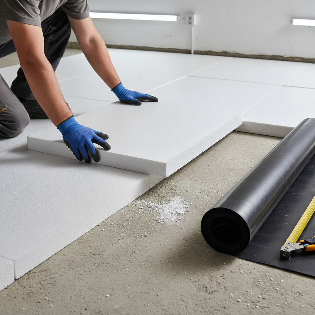 Na czystym podłożu rozłóż folię przeciwwilgociową. Układaj ją na zakłady o szerokości ok. 15 cm, a łączenia sklej specjalną taśmą. Pamiętaj, aby wywinąć folię na ściany na wysokość ok. 10 cm, powyżej planowanego poziomu posadzki. Na tak przygotowanej folii rozłóż płyty styropianowe lub wełnę mineralną. Układaj je mijankowo (na „cegiełkę”), szczelnie dociskając jedną do drugiej, aby uniknąć mostków termicznych.