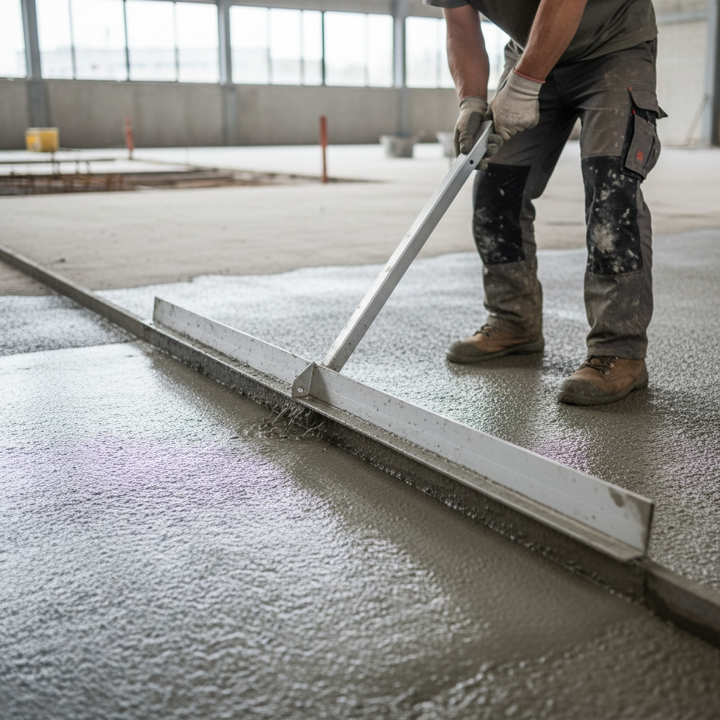 Opierając łatę na dwóch sąsiednich prowadnicach, przesuwaj ją zygzakowatym ruchem w swoją stronę, ściągając nadmiar zaprawy. Jeśli pojawią się ubytki, uzupełnij je świeżą zaprawą i ponownie wyrównaj powierzchnię. Po wstępnym związaniu betonu (gdy można na nim ostrożnie stanąć, nie zostawiając głębokich śladów), przystąp do zacierania. Najpierw użyj pacy styropianowej, wykonując koliste ruchy, a następnie wygładź powierzchnię pacą stalową. Jeśli planujesz układać płytki, ten krok można pominąć.