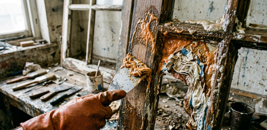Skrobanie ręczne: Użycie samych skrobaków bez podgrzewania jest bardzo pracochłonne, ale może być konieczne w przypadku bardzo delikatnych, zdobionych ram lub w miejscach, gdzie użycie opalarki jest ryzykowne (np. blisko uszczelek, których nie chcemy uszkodzić).
