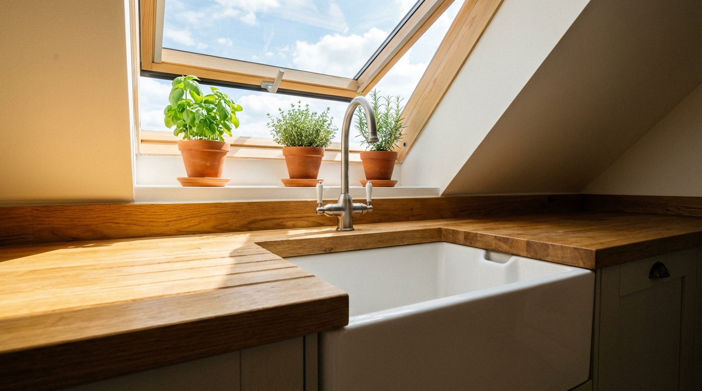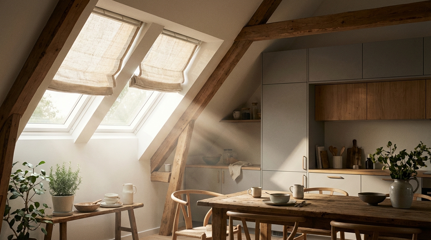 Światło to jeden z największych skarbów poddasza. Odpowiednio dobrane i rozmieszczone okna dachowe mogą uczynić kuchnię miejscem jasnym, energetyzującym i optycznie większym.