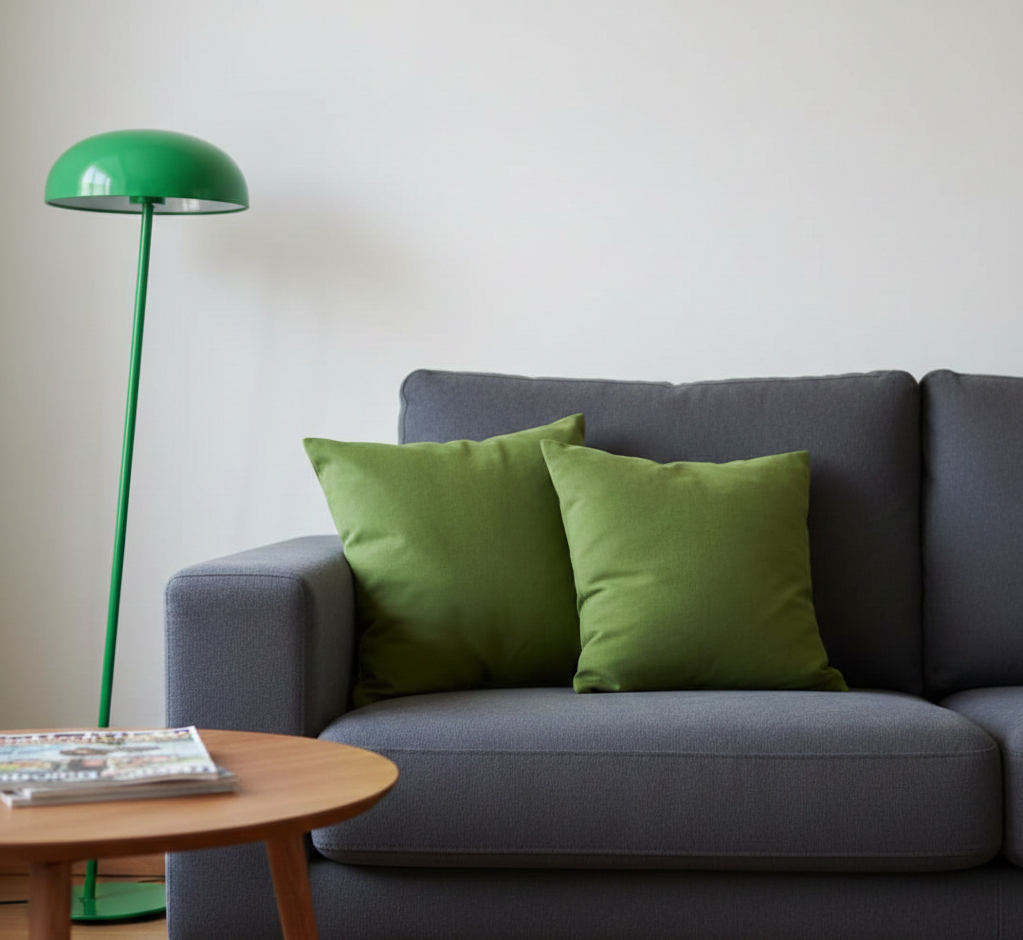 Spójność kompozycji zapewniły starannie dobrane dodatki. Zielone akcenty w odcieniu Parrot Green powtórzono w tekstyliach (poduszki na kanapie), oświetleniu (abażur lampy) oraz w postaci żywych roślin w doniczkach. Dzięki temu cała aranżacja stała się przemyślana i niezwykle estetyczna.