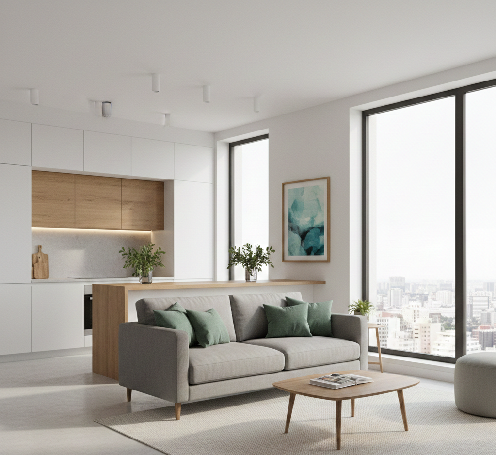 Nowo powstały salon z kuchnią stał się sercem mieszkania – miejscem relaksu, spotkań i wspólnego gotowania. Aby przestrzeń była spójna i harmonijna, postawiono na stonowaną, ale świeżą paletę barw oraz wysokiej jakości materiały.