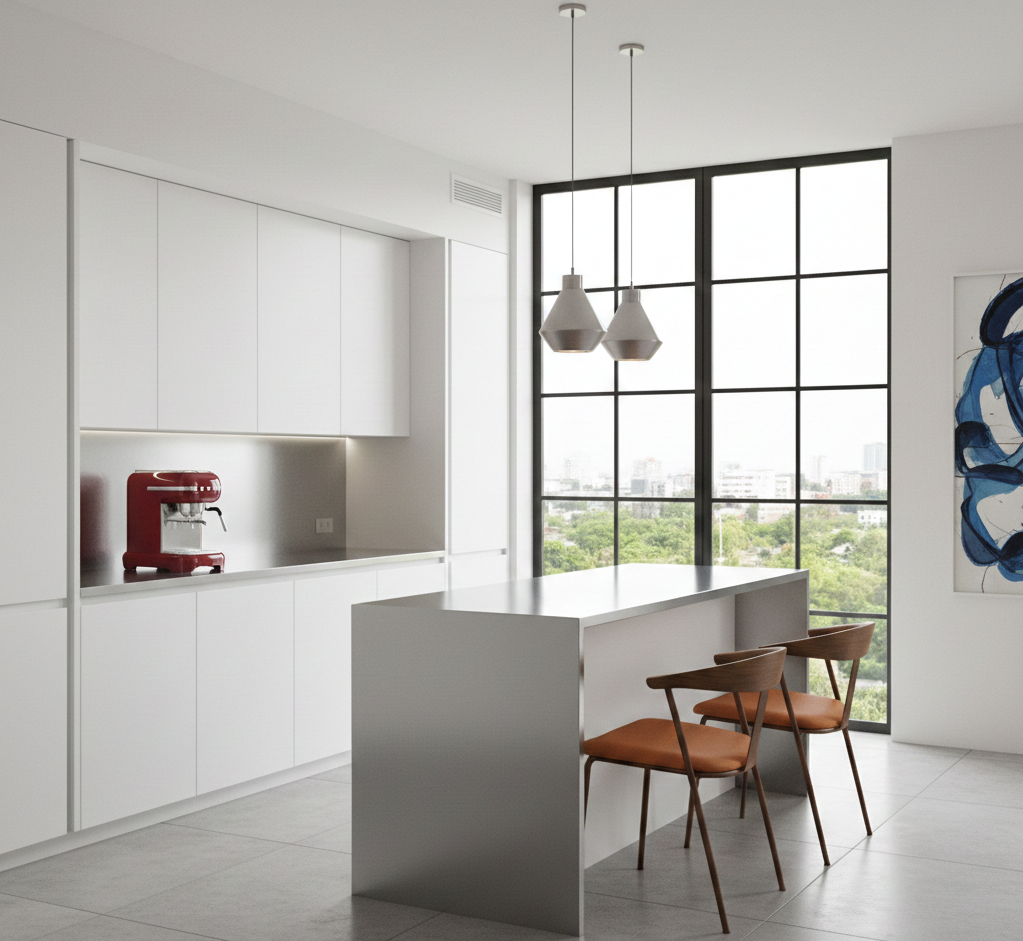 Poczucie przestronności: Brak ścian sprawia, że nawet małe mieszkania wydają się znacznie większe i jaśniejsze. Światło dzienne swobodnie przepływa przez całą strefę dzienną.